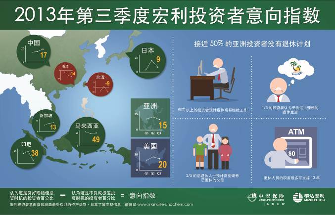 中国北京 -2013年11月5日,中宏人寿保险有限公司和泰达宏利基金管理有限公司今天共同发布了亚洲“宏利投资者意向指数”(下称“MISI指数”)第三季度最新调查结果。基于来自亚洲七个市场的3,500份调查样本,此项调查旨在从深层次揭示亚洲的投资者意向,上述两家机构自今年以来第三次公布季度调查结果。