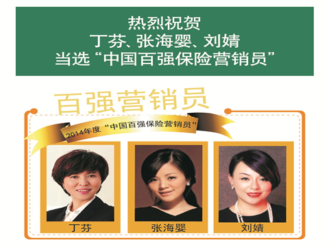 中宏保险优秀营销员丁芬、张海婴、 刘婧当选“中国百强保险营销员”,张金萍、陈萍、佘振玉、盛茵慈、任平玲、张凤娇、窦丽蓓、黄国生以及李艳当选“中国百强保险营销员提名人物”,恭喜各位业务精英!